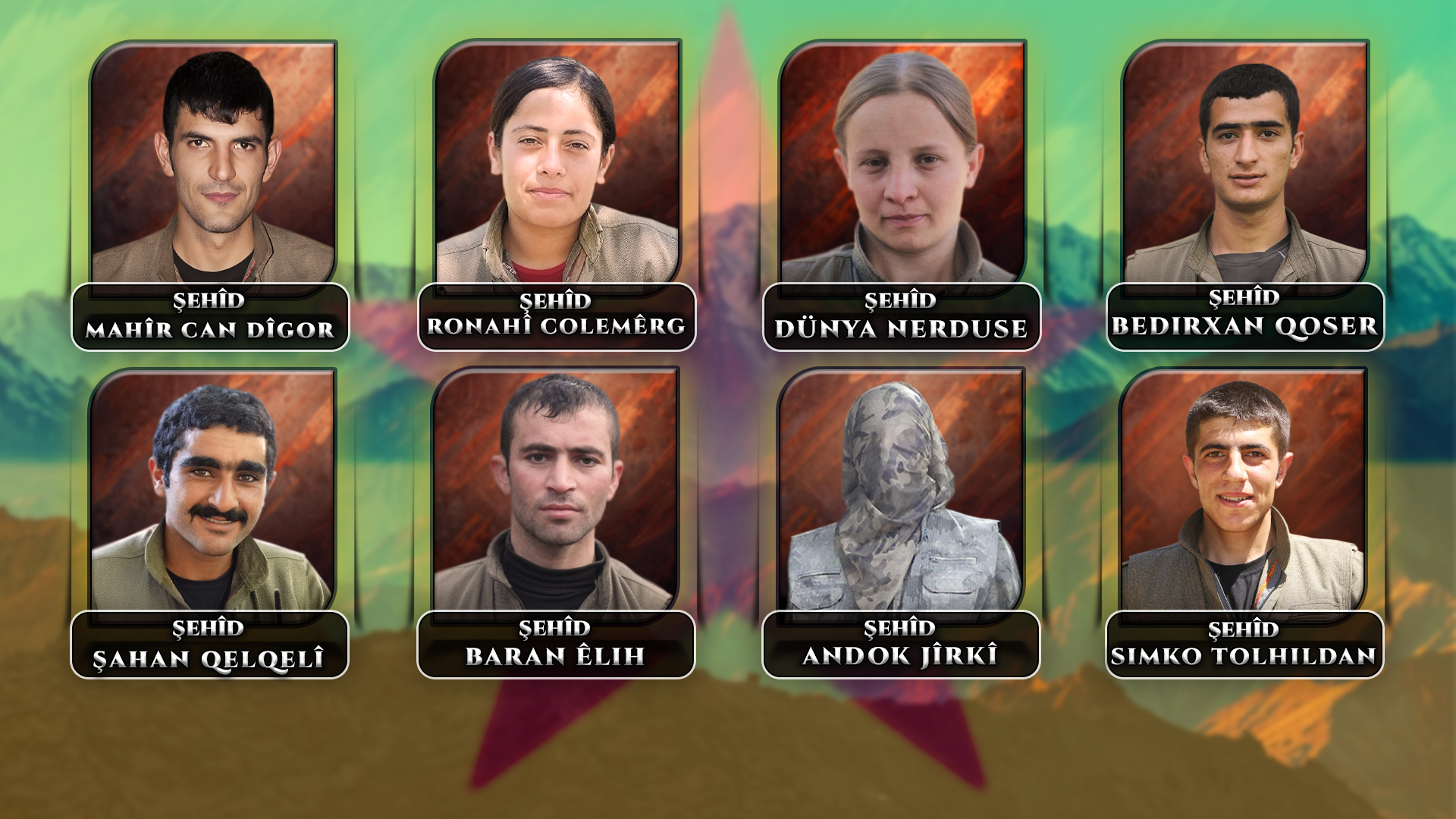 Ronahî, Dünya, Bedirxan, Mahîr, Baran, Andok, Simko ve Şahan yoldaşlarımız, yüreklerindeki özgürlük tutkusuyla yüzlerini Kurdistan dağlarına döndüler. Varlıklarını Kürt halkının özgürlük davasına adayarak birer Apocu fedai militan oldular.